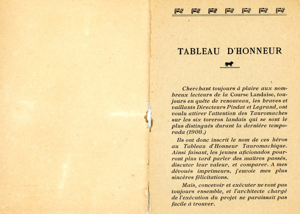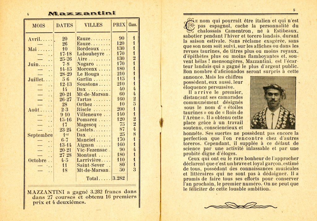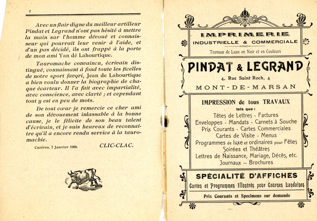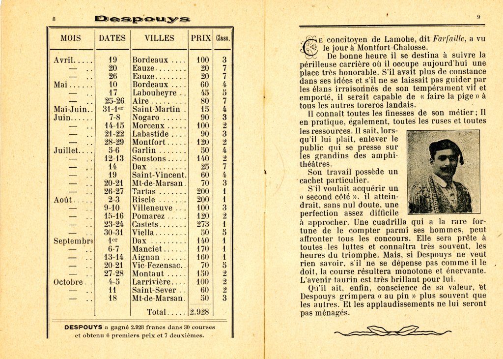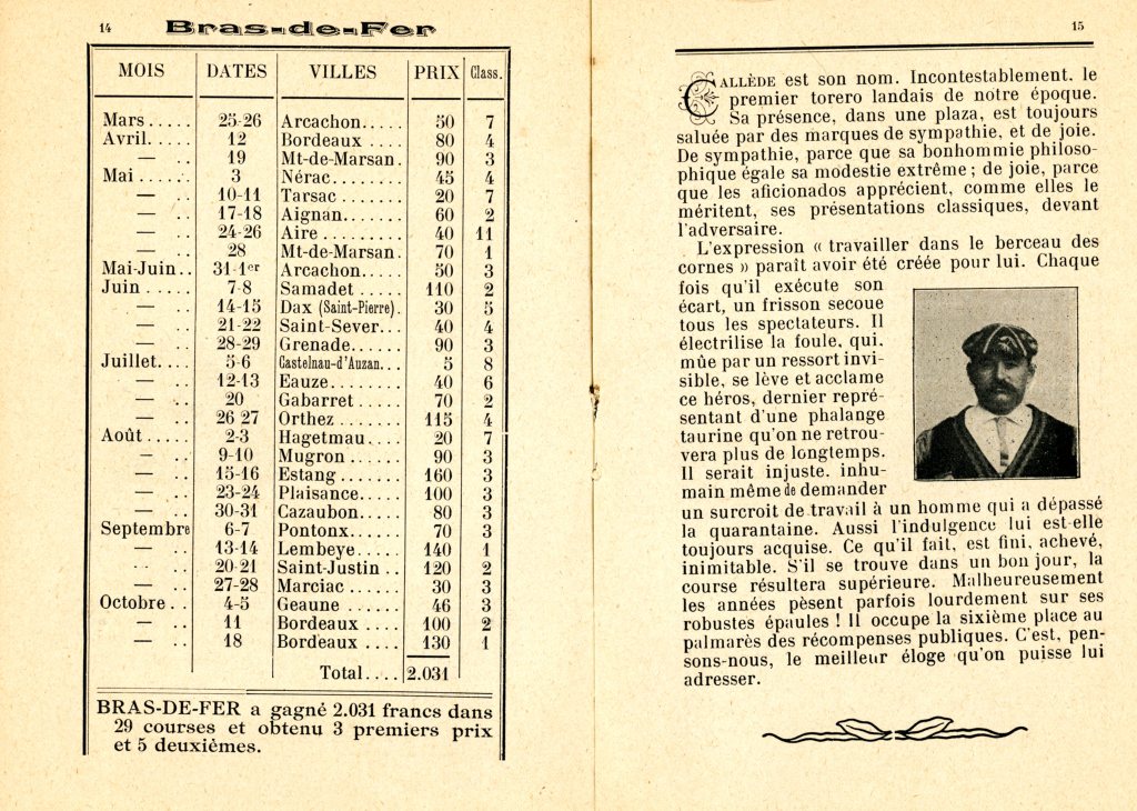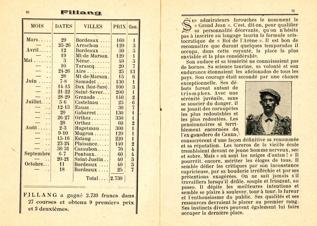 « Les bigotes (moustaches) étaient réservées aux Français. En Espagne étaient glabres les toreros et les… curés. Sur la photo, il me semble deviner à gauche Émile Saumur qui fit partie un temps du cuadrille du Pouly ; par contre à droite de la photo, et avec certitude, j’écris qu’il s’agit de Pierre Clarion dit Trompette.