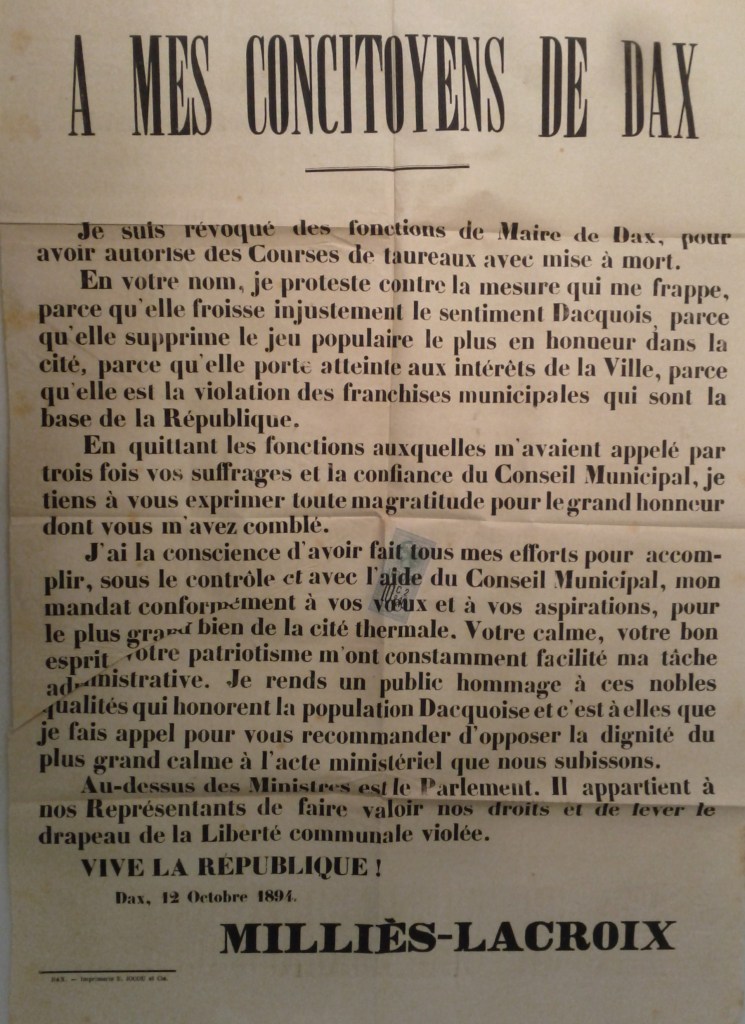 Il est surtout connu pour avoir été révoqué de ses fonctions de maire en octobre 1894 par décret du président de la République Casimir Périer, pour avoir autorisé ouvertement, malgré l’avis contraire de l’autorité préfectorale, des courses de taureaux avec mise à mort. La population de Dax le réélit cependant maire dès l’année suivante. Voici la déclaration publique qu’il rédigea et publia à l’occasion de cette affaire (Archives dép. des Landes, 4 M 117).